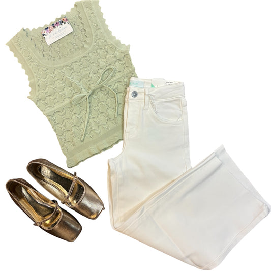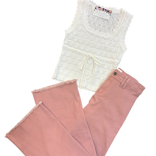 Geo Knit Pattern Scalloped Waist Tie Strap Tank in Ivory
