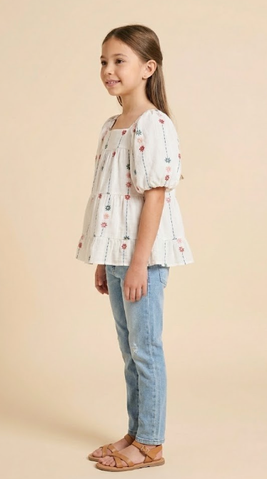 Girls Floral Embroidered Puff Sleeve Tiered Top