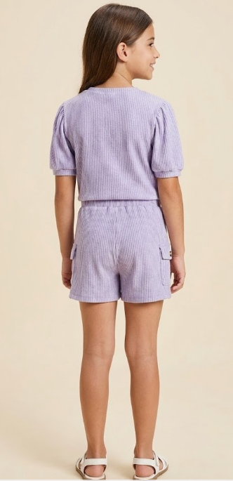 Girls Washed Look Ribbed Knit Puff Sleeve T Shirt in Lavender