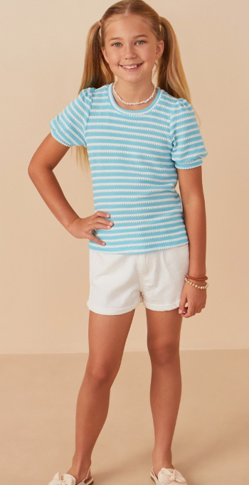 Girls Textured Stripe Puff Sleeve Knit Top in Blue