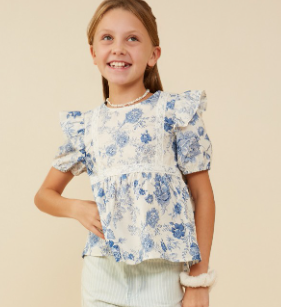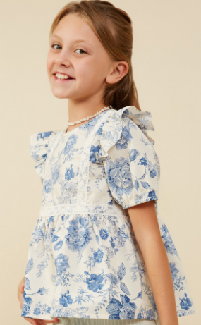 Girls Antique Floral Lace Trimmed Ruffle Top *Floral Print Fabric *Ruffle Detail *Lace Trimmed
