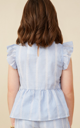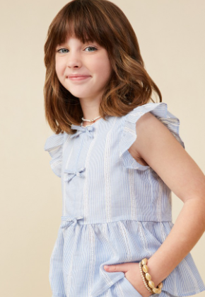 Girls Bow Detailed Crochet Lace Ruffle Tank *Stripe Woven Fabric *Ruffle Sleeve *Ribbon Detail