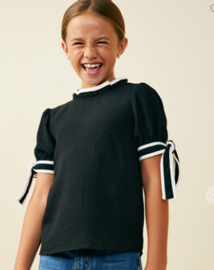 Girls Contrast Piped Tie Sleeve Detail Top *Textured Woven Fabric *Tie Sleeve *Back Keyhole Closure