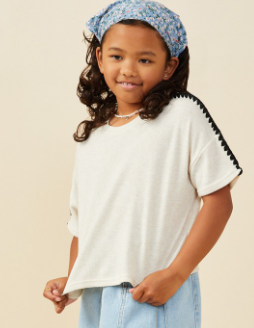 Girls Contrast Stitch Detail Drop Shoulder Knit Top *Light Weight Hacci Fabric *Round Cut Neckline *Contrast Crochet Detail