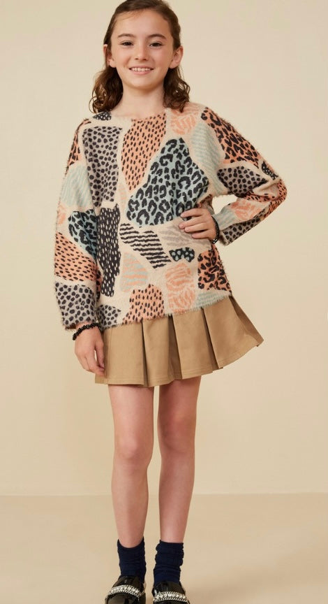 Girls Fuzzy Textured Abstract Leopard Sweater