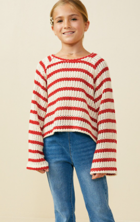 Girls Open Knit Striped Loose Knit Top *Stripe Knit Fabric *Round Cut Neckline *Loose Fit
