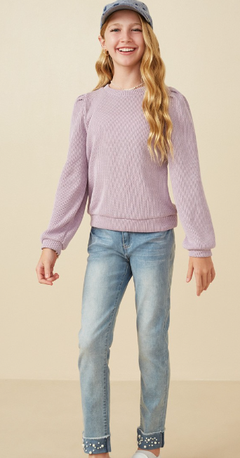 Girls Ribbed Knit Banded Detail Mock Neck Top *Rib Knit Fabric *Round Neckline *Puff Sleeves