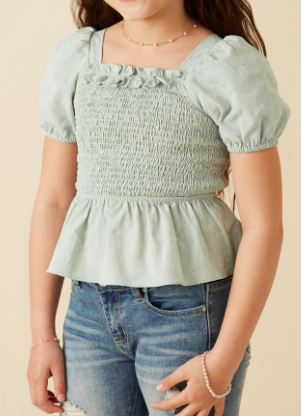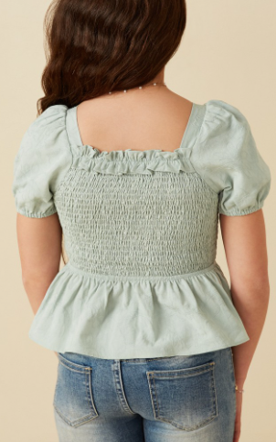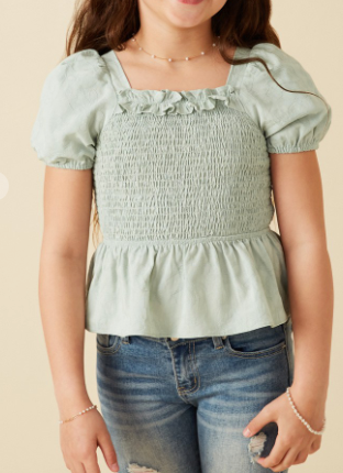 Girls Ruffle Detail Smocked Floral Embroidered Top *Floral Embroired Fabric *Square Cut Neckline *Cuff Sleeve