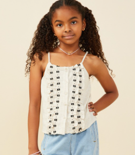 Girls Ruffled Tape Trim Linen Tank *Linen Blend Woven Fabric *Lace Trim Detail *Spaghetti Strap