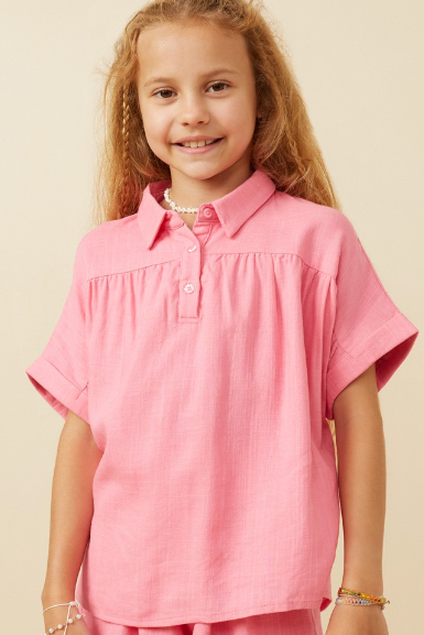 Girls Short Sleeve Collared Dolman Top *Linen Blend Woven Fabric *Collar Neckline *Dolman Sleeve