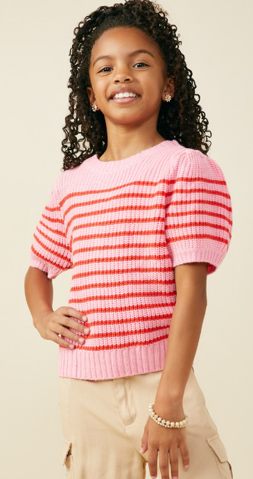 Girls Striped Puff Sleeve Short Sleeve Sweater Knit Top *Stripe Knit Sweater *Round Cut Neckline *Puff Sleeve