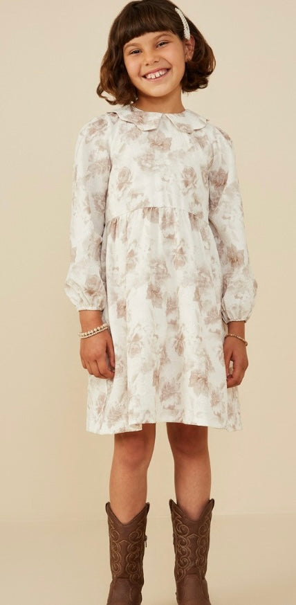 Girls Textured Antique Floral Scallop Collar Dress *Textured Antique Fabric *Collared Neckline *Cuff Sleeve
