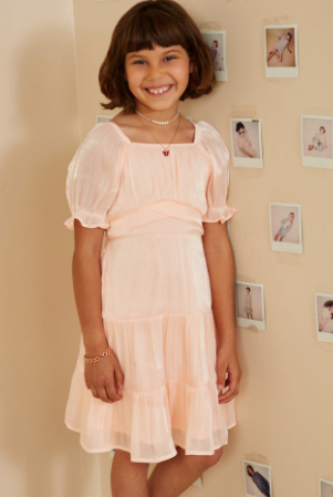 Girls Textured Shimmer Tie Detail Dress in Peach