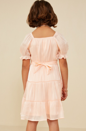 Girls Textured Shimmer Tie Detail Dress *Textured Knit Fabric *Square Cut Neckline *Bell Sleeve