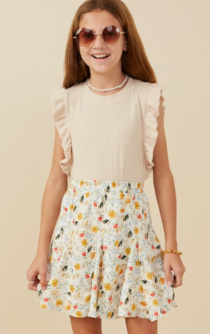 Girls Wispy Floral Tiered Flare Skirt *Ribbed Knit Fabric *Round Cut Neckline *Ruffle Shoulder
