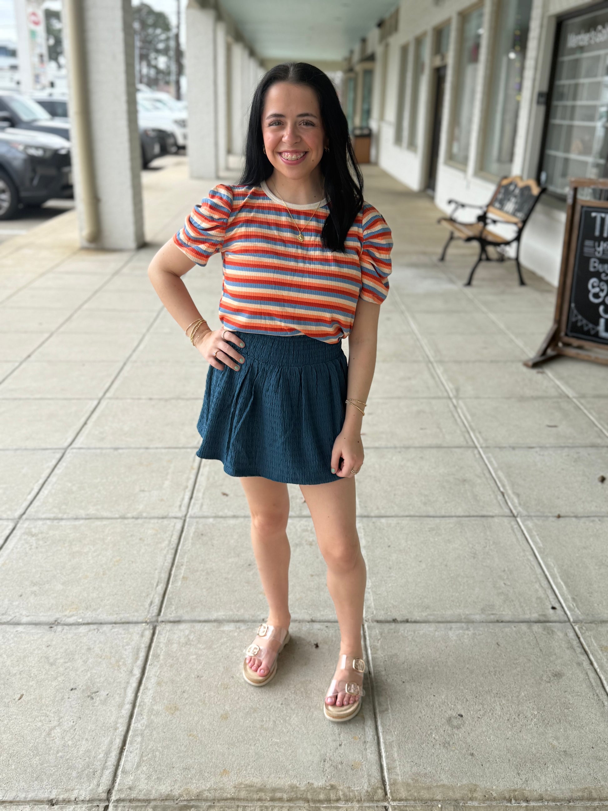 Multi Color Stripe Ribbed Knit Puff Shoulder Top in teal mix
