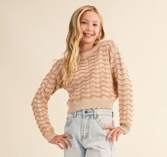 Tween Girls Wavy Pointelle Longsleeve Sweater